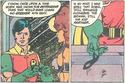 Punning became a trait and symbol of Dick Grayson's departing youth. When Dick gave up his identity as Robin in New Teen Titans, #39, he not only took off his mask, but he also set his juvenile jokes in the past.